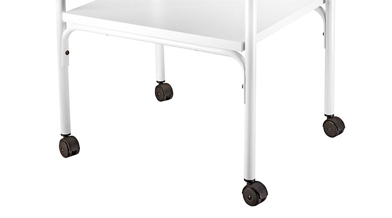Ripiani in legno lavabile antigraffio. Ringhiere salva oggetti. Cassetto e ruote piroettanti.