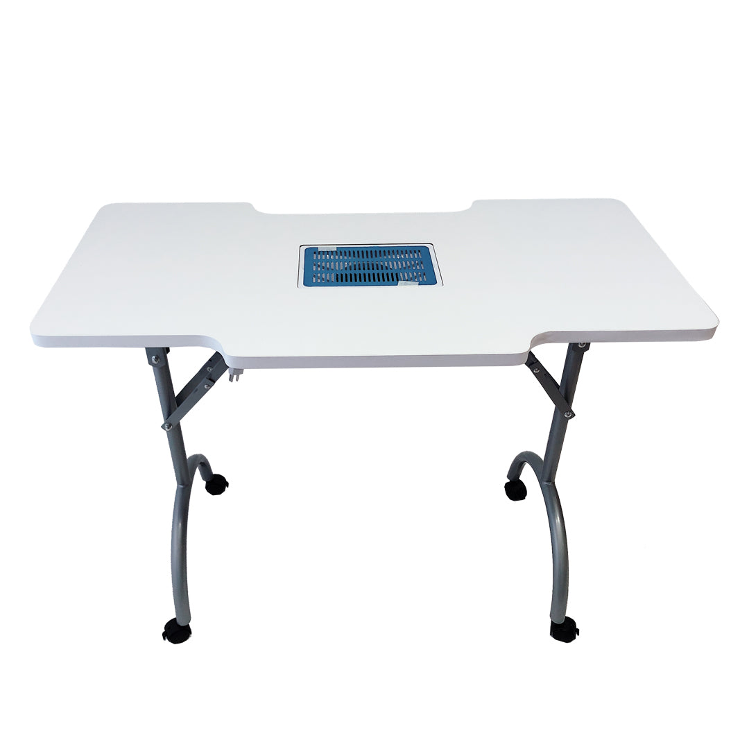 Esclusivo tavolo portatile pieghevole per manicure e ricostruzione unghie pensato per poter essere comodamente piegato e riposto dentro la sua pratica borsa (in dotazione) per poter effettuare servizi di manicure e ricostruzione unghie anche a domicilio. Questo tavolo è inoltre dotato di un silenzioso aspiratore, un contenitore per raccogliere facilmente la polvere delle unghie e un cuscinetto ergonomico poggia mani facilmente lavabile per assicurare il massimo comfort al cliente durante qualsiasi tipo di trattamento.