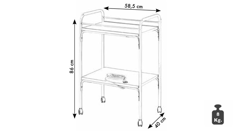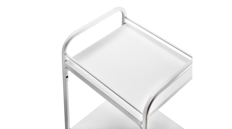 Carrello con due ripiani in acciaio con struttura in acciaio verniciato a polvere epossidica.