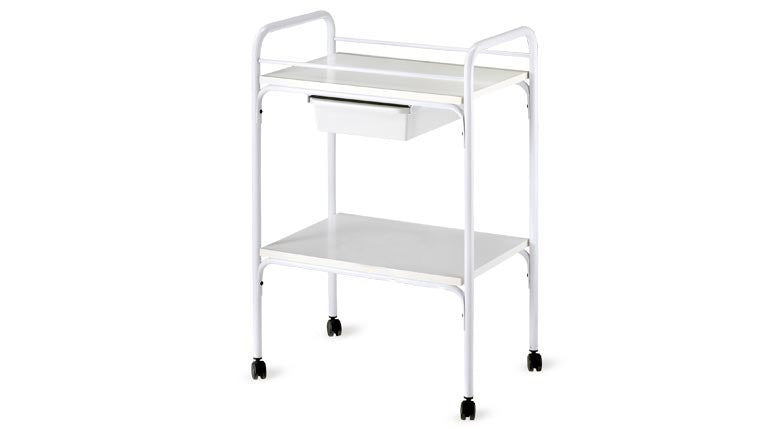 Carrello in acciaio con 2 ripiani e cassetto estraibile.
