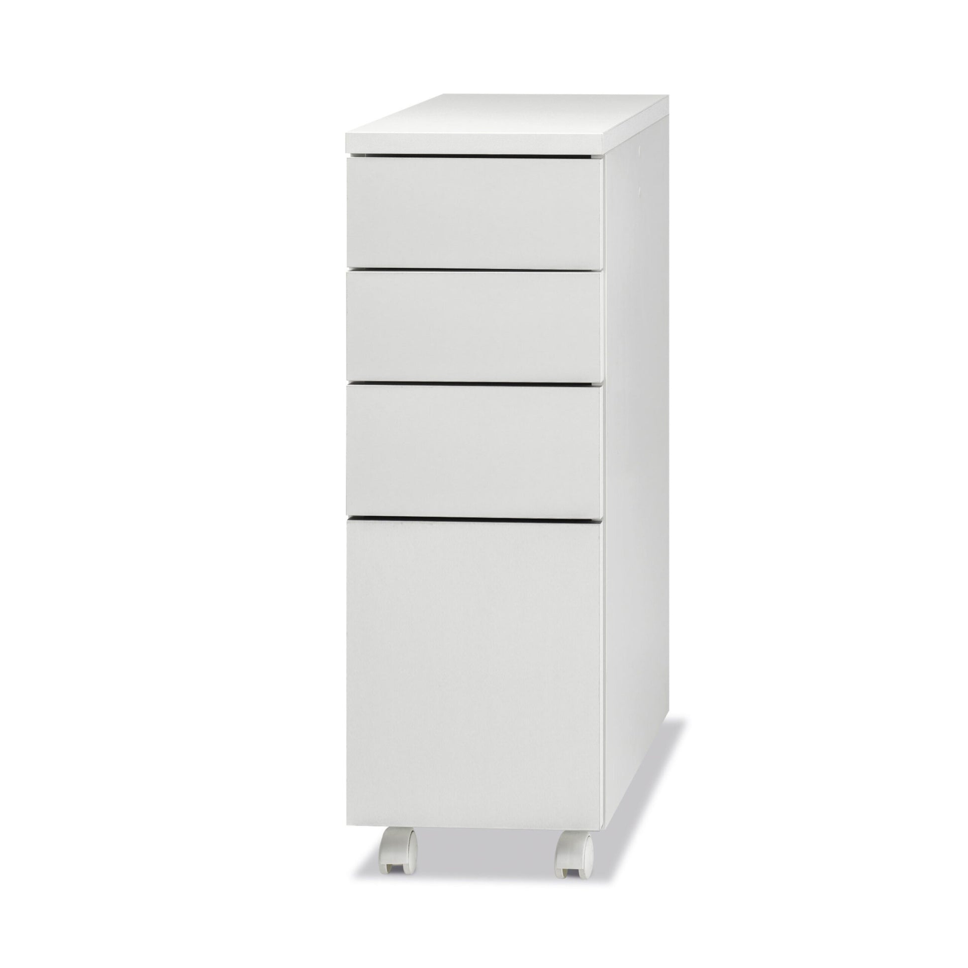 Struttura in nobilitato bianco, spessore 18mm. Frontali cassetto bianco / rovere / cemento. Guide cassetto push & pull, con ruote piroettanti